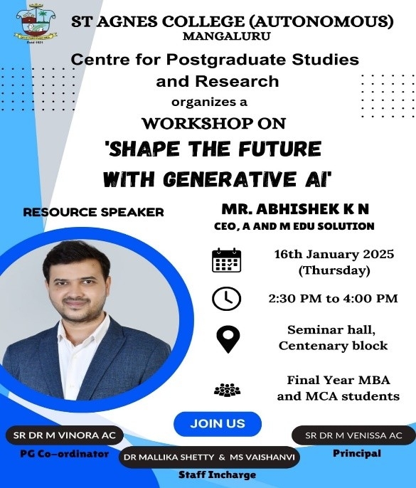 The Centre for Postgraduate Studies and Research at St. Agnes College (Autonomous), Mangalore, organized a workshop titled “Shape the Future with Generative AI” on January 16, 2025. The session was designed to enhance students’ understanding of generative AI, with a focus on prompt engineering and practical AI applications.