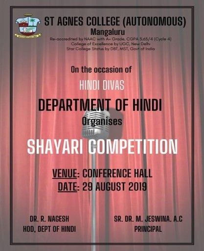 A Shayari competition was conducted by the Department of Hindi, St Agnes College (Autonomous), Mangaluru on 29 August 2019 to recognize the talent of creating Shayari by the students. Total of 26 students participated enthusiastically in this competition. This event shined light upon the talents of our students in becoming poets, artists and shayars of the coming generation.