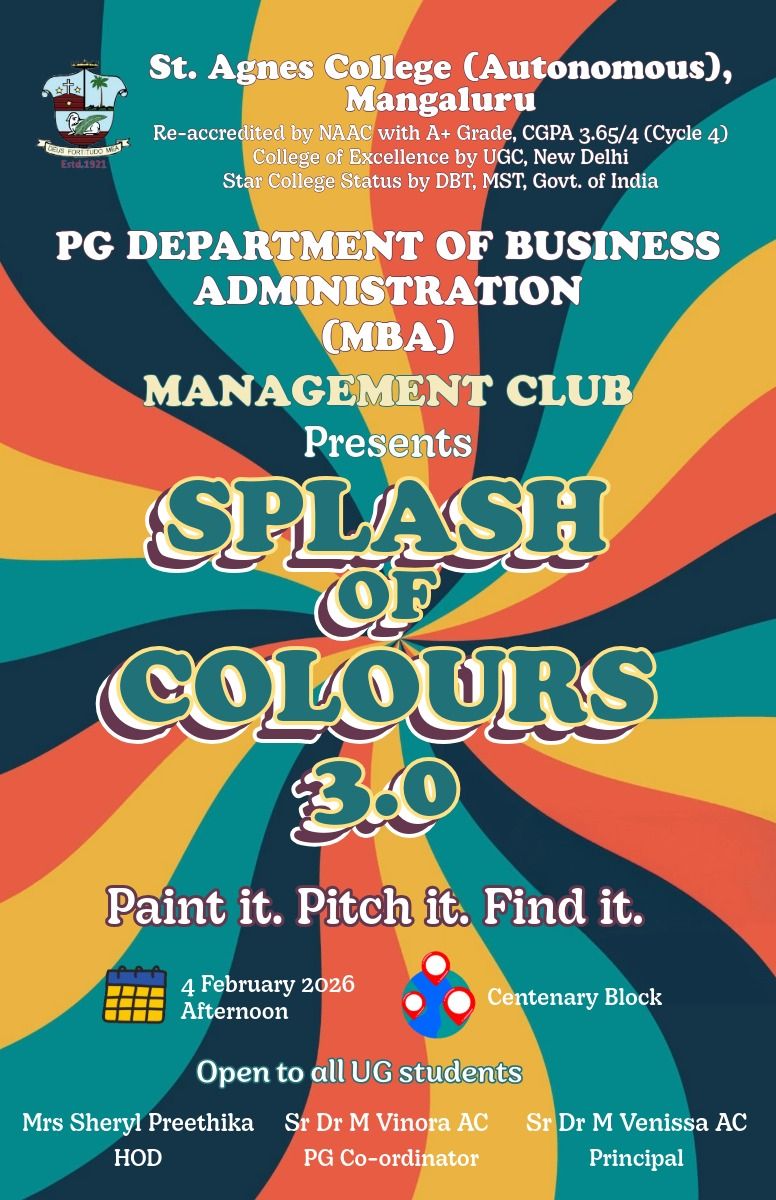 The Department of MBA, St Agnes College (Autonomous), Centre for Postgraduate Studies & Research, Mangaluru, successfully organized a series of engaging and creative competitions for UG students under the title “Splash of Colours 3.0” on 4th February 2026. The main objective of the fest was to provide students with a platform to showcase their talents in marketing, creativity, teamwork, communication, and artistic skills.