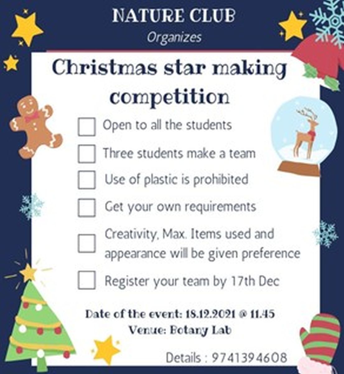 On 18 December 2021, Nature Club, St Agnes College (Autonomous), Mangaluru organized a Star Making Competition on account of Christmas celebrations in the college. The participants were allowed to use only Biodegradable items to make the star and use of plastic was restricted. The judgment was based on the maximum number of materials used, creativity and the appearance of the star. The competition was open to all the students of the college.