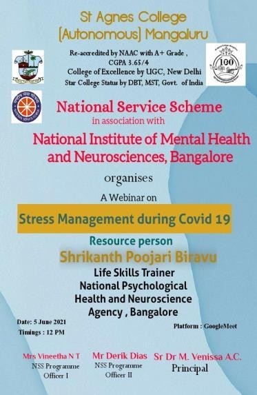 The NSS units of St. Agnes College organised a webinar “ Stress management during Covid -19” on 5th June 2021 . The objective of this webinar was to help all students overcome the stress and fears faced during this Pandemic. The program began at 12 noon . NSS program officer Mr. Derik Dais welcomed all and introduced the resource person of the program to the audience. The resource person for the program was Mr. Shrikant Poojari Biravu, Life Skills Trainer, National Psychological Health and Neuroscience Agency, Bangalore. Mr. Shrikant spoke on various aspects related to stress & stress management. He also enlightened the participants on the use and abuse of drugs by youngsters and ill- effects of the same. He encouraged the participants to share their ideas, opinions and problems which they or their friends are likely to encounter. He expressed his willingness to extend a helping hand to all those who wished to share their problems with him personally. The session was very encouraging, enriching and educative. The program ended at 1.00 pm . It was compered and moderated by Ms. Shrividya, NSS student leader. Vote of thanks was