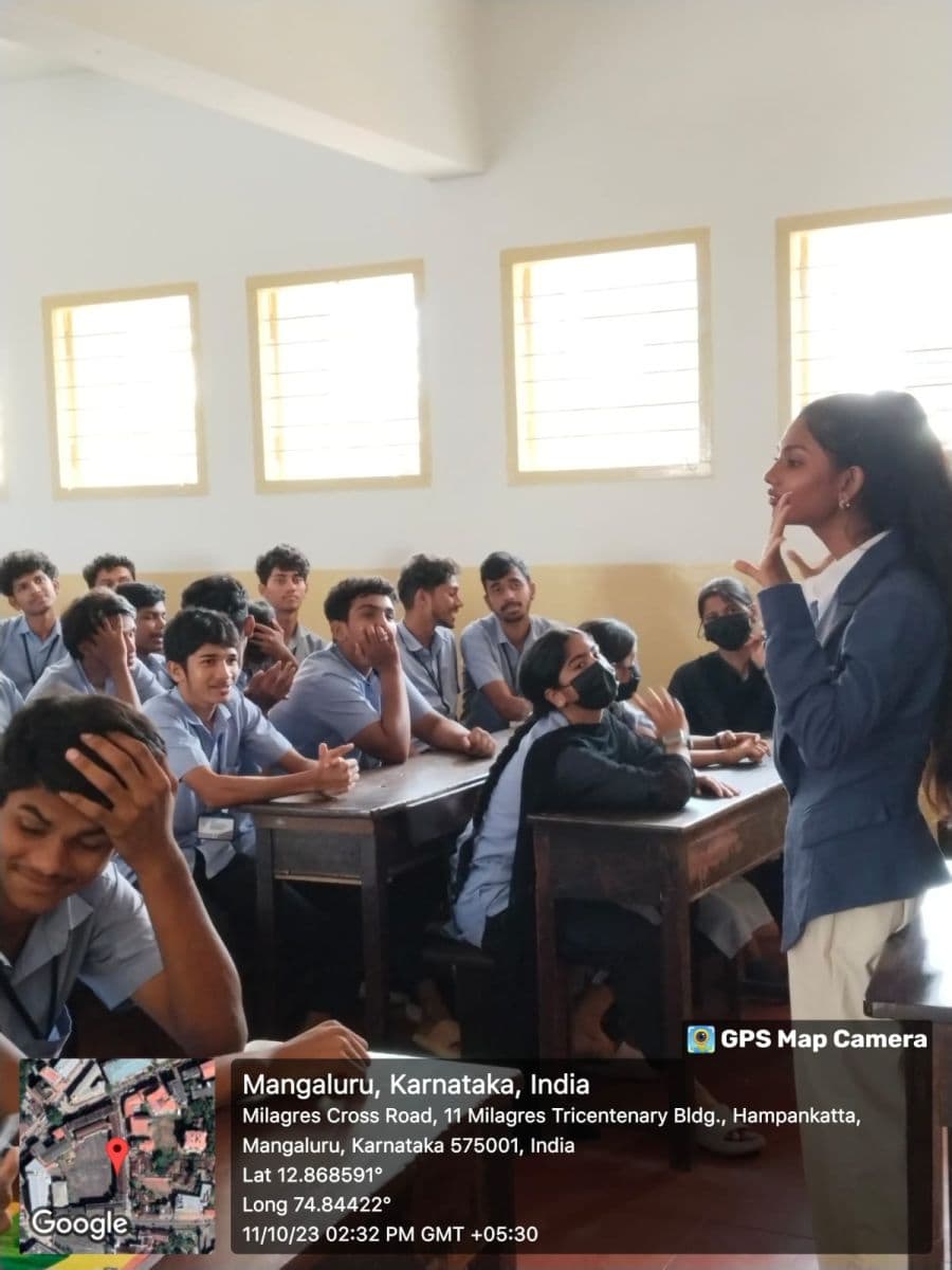 The Students of Department of Business Administration, St Agnes College (Autonomous), Mangaluru were the resource speakers at Milagris PU College on 11 October 2023. The topics covered during the session ranged from “Study Techniques” and “Body Language” to “Leadership” and “Self-Acceptance.” This one-hour session proved highly rewarding, benefiting not only the PU students but also the guest speakers. The hands-on experience during the session significantly improved the students’ public speaking abilities, while also shedding light on aspects like managing an audience and understanding the various types of listeners. In conclusion, the time spent with the students was both enjoyable and enlightening, leaving a positive and educational impact on all participants.