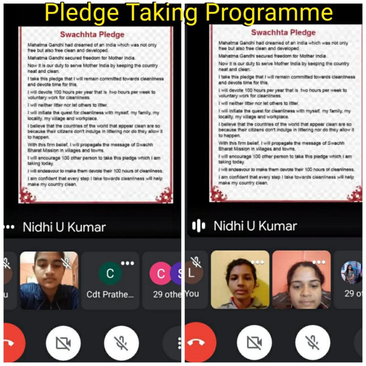 On 1 December Pledge taking on Swachhta Abhiyan was held and other activities were initiated. On 2 and 3 December cadets were involved in Slogan writing competition on the Significance of Cleanliness. On 4 December Vanamahothsava was celebrated, the cadets planted saplings of different variety. From 5 to 7 December cadets took part in model presentation and presented many Eco friendly Models. From 8 to 10 December there was Digital Poster Making competition on the topics, Energy Conservation and Water Conservation. From 11 to 13 December cadets rendered their services in Cleanliness Drive and they have cleaned their respective areas. On 14 and 15 December cadets created awareness on cleanliness its importance and benefits through the social media applications by spreading messages, posting slogans, paintings and posters.