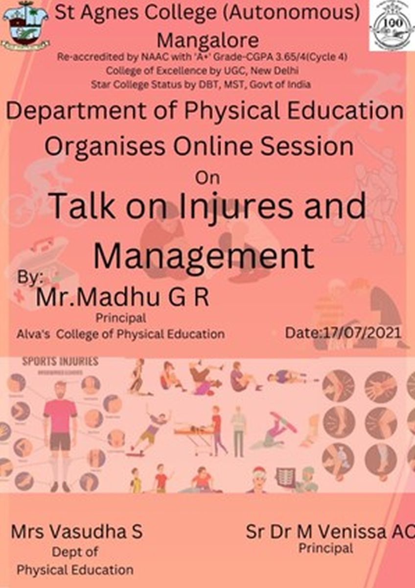 The Department of Physical Education organized an online session on “Talk on Injuries and Management” on 17 July 2021. Mr Madhu G R, the Principal of Alvas College of Physical Education, Moodbidri was the resource person. The session was conducted for Sports Association students, focusing on the topic of Top Common Sports Injuries and Management.