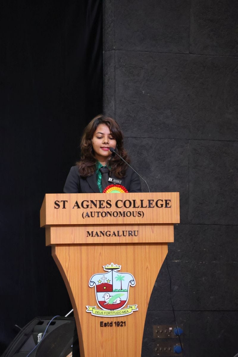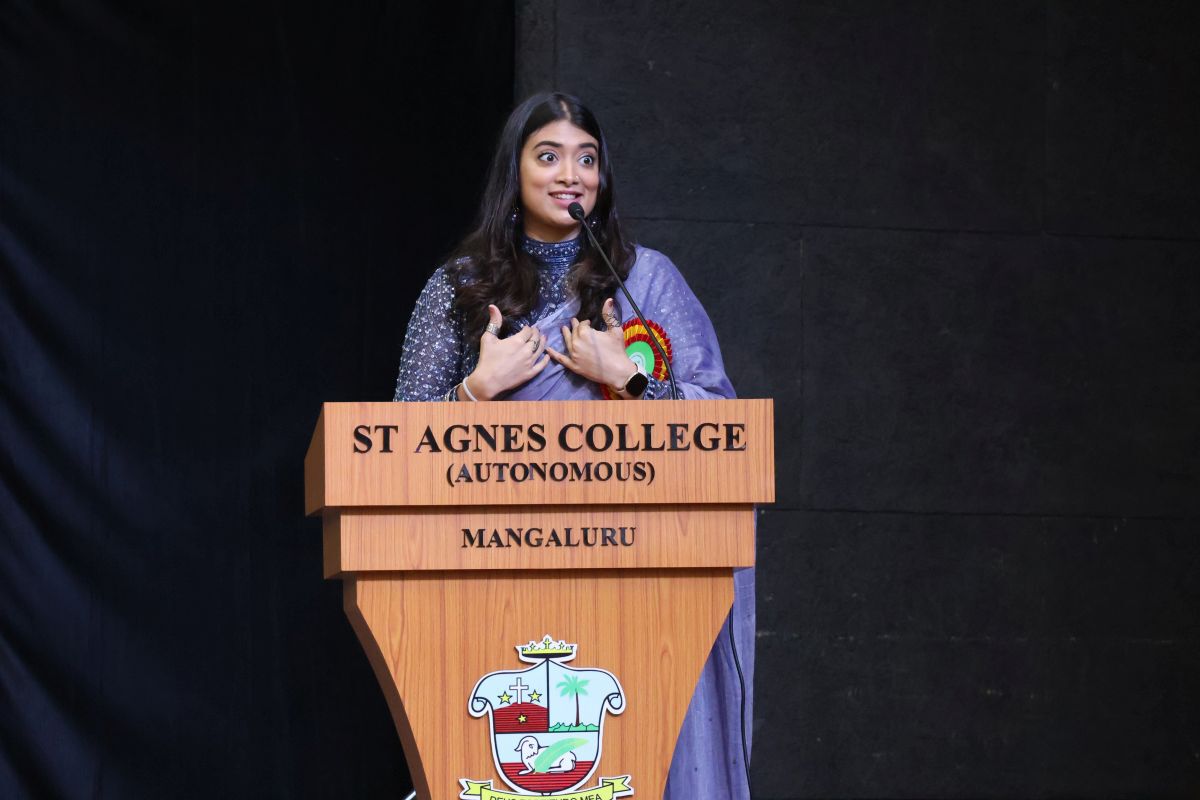 The Chief Guest for the day was Ms. Madhuri Braganza, who is a special needs educator and a film actress of renown in the South Indian Cinema, including Kannada and Malyalam. In her address, she acknowledged her roots and said both her grandmothers studied at St. Agnes College, in their time. She completed her early education in Bangalore and then went on to do an MA in Special Educational Needs and Inclusion. She told the audience that as a student she looked forward to the fests and cultural events which gave her a rich experience and platform to showcase her skills and talents. She also encouraged the students by telling them that failure is only a stepping stone on the road to success. She spoke on the key ideals of happiness, the importance of helping others, the need for a good sense of humour, the value of healing and the constant ability to hone ones skills and keep growing as learners in life. Upon the request of the audience the Chief Guest who besides being an actor is also a singer, sang a song which was well appreciated with a standing ovation. The Principal in her address appreciated the efforts put in by the staff and students of the organising team. She offered her good wishes to all the participants and special guests. The program concluded with the vote of thanks proposed by Mrs. Helen Serrao, Dept of Chemistry.