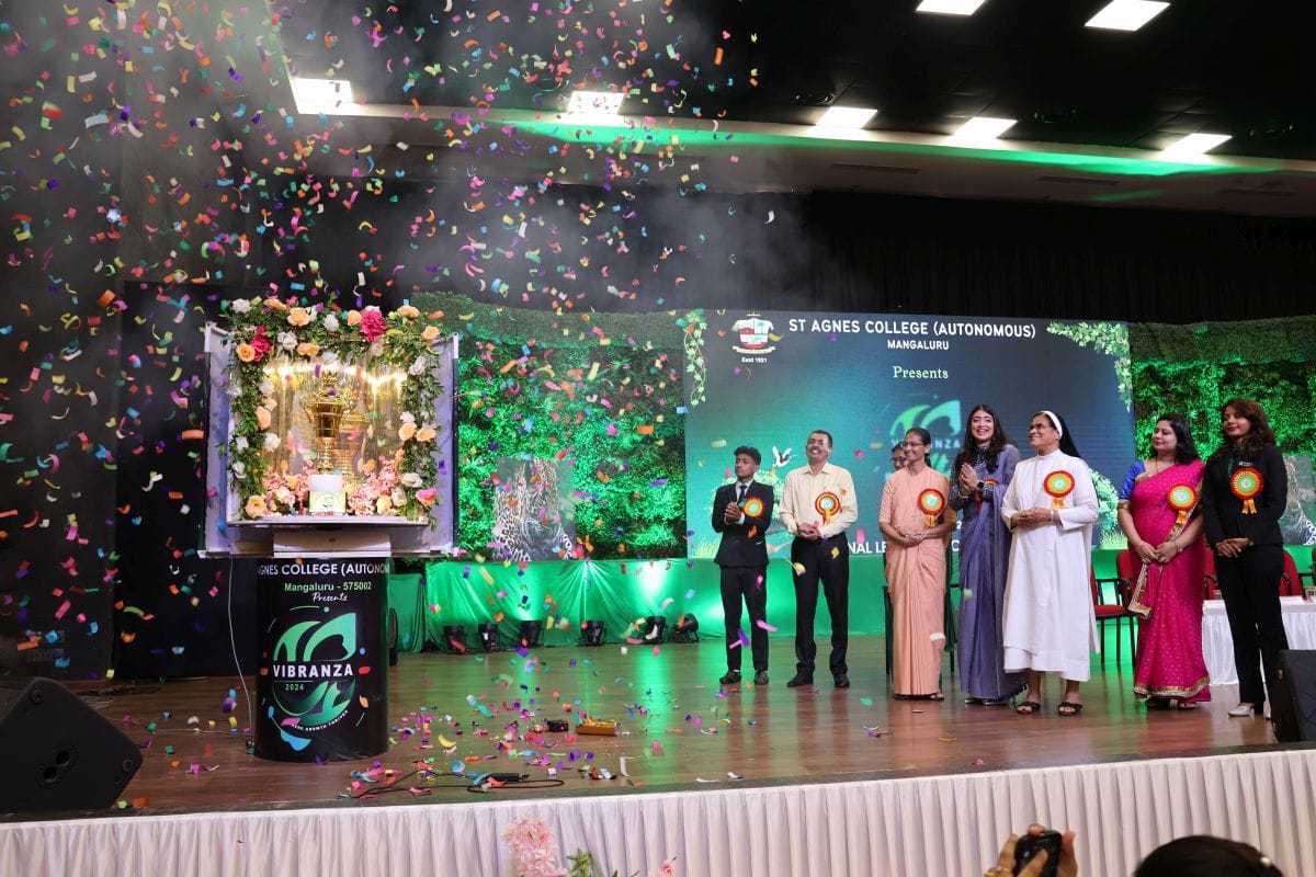 The inaugural of Vibranza 2024 commenced with a grand receptionwhere the chief guest was received with full honour at the main entrance and led to the auditorium in a traditional gala procession. The program commenced with an invocation seeking divine blessings on the occasion. A theme dance showcasing the vibrancy of nature and exhibiting growth and exuberance was a show stealer that left the audience spell bound. Among the dignitaries on dais along with the chief guest were the Sr. Dr. M. Venissa A.C, the Principal of the college, Sr. Dr. M. Maria Roopa A.C, the Joint Secretary of St. Agnes Institutions, Mrs. Sabeena D’Souza the convenor of Vibranza 2024, Dept of Business Administration and the Assistant Convenor Mrs. Helen Serrao, Dept of Chemistry, the PTA President, Mr. Ravi Bhat and the Student Presidents Ms. Privy D’souza and Mr. Pratheek Rai, of the Undergraduate and Postgraduate Streams respectively.