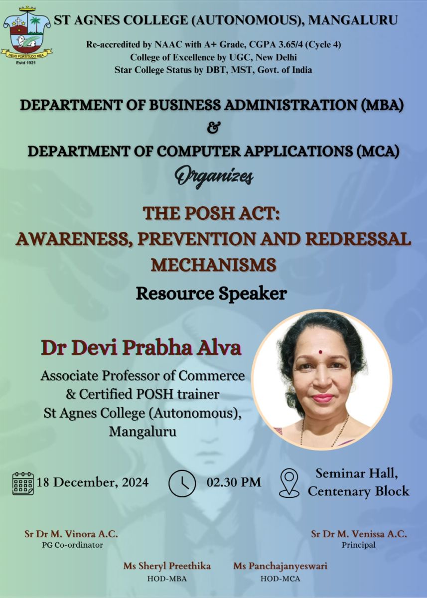 The session emphasized the importance of awareness and proactive measures in preventing workplace harassment while ensuring gender equality and dignity. Faculty members from the MBA and MCA departments supported the program. The session was interactive, engaging, and well-received by the participants, who appreciated the valuable insights provided.
