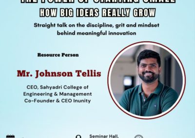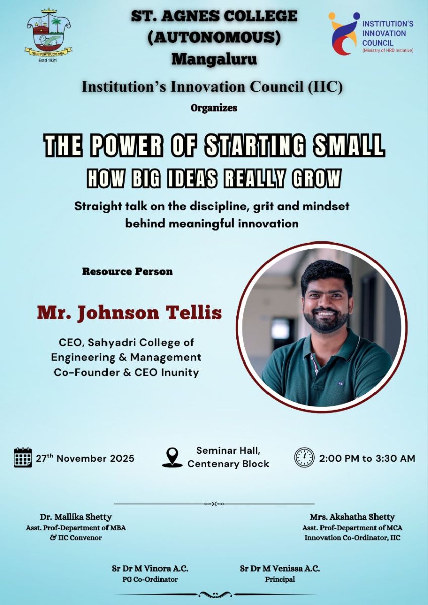 The Institution’s Innovation Council (IIC) of St. Agnes College (Autonomous) organised a session on 27th November 2025, open to all interested students of the St. Agnes College, on ‘The Power of Starting Small, How Big Ideas Really Grow – straight talk on the discipline, grit and mindset behind meaningful innovation’, as part of its upcoming campus entrepreneurship challenge – ‘Innovate and Elevate’.