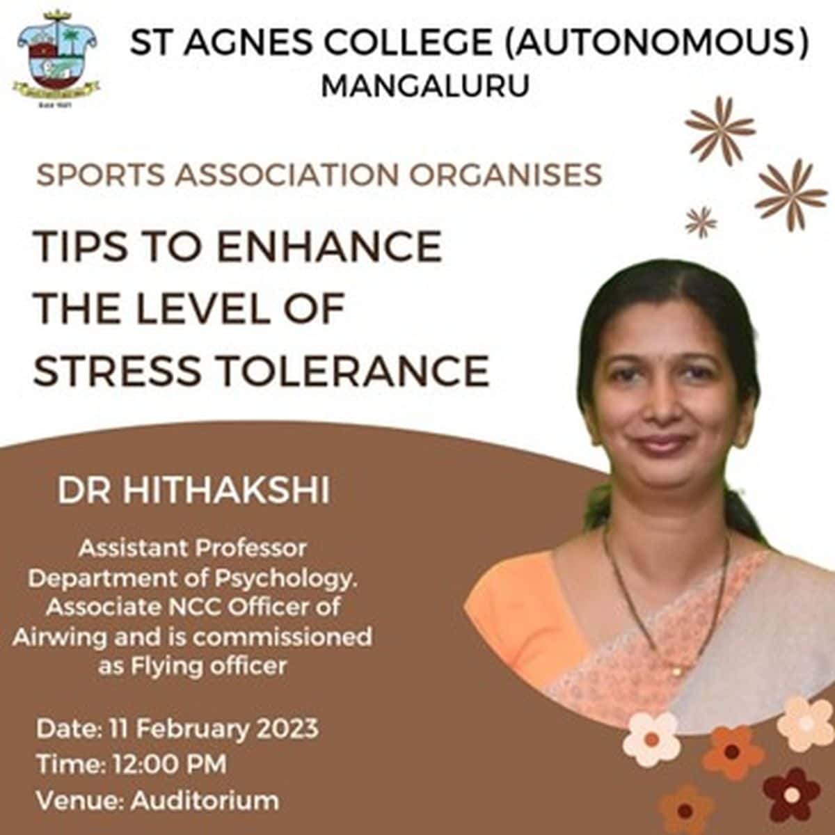 The Sports Association, St Agnes College (Autonomous), Mangaluru hosted an event focused on “Tips to Enhance Stress Tolerance” on 11 February 2023. Dr Hithakshi was invited as a Guest Speaker to share her insights on stress management and how to effectively control stress. 99 students attended this session.