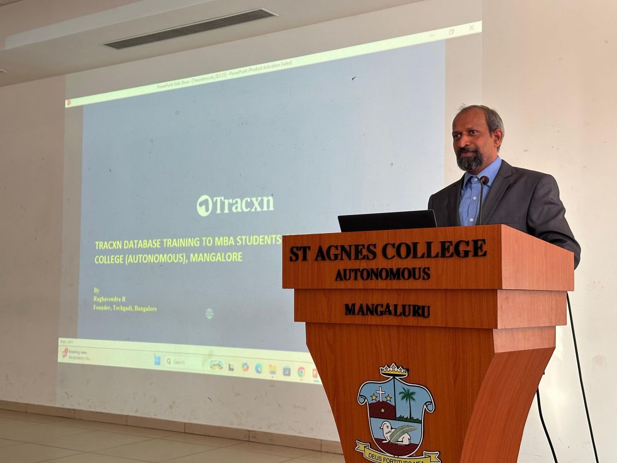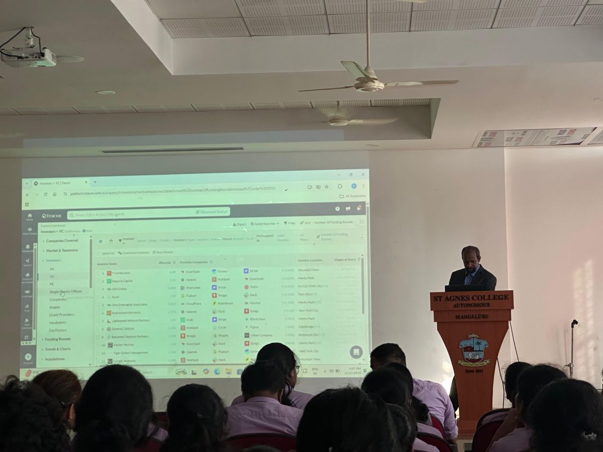 The programme began with a brief welcome by Pramila Lobo from II MBA, who greeted the gathering and introduced the speaker. Mr. Raghavendra then provided an overview of the Tracxn platform, explaining its purpose, structure, and relevance in academic research. He demonstrated the various features of the database, including how to search for companies, analyze startup ecosystems, track funding activities, and study industry-specific trends. His step-by-step walkthrough helped students understand how the platform can be effectively used for assignments, project work, case studies, and presentations.