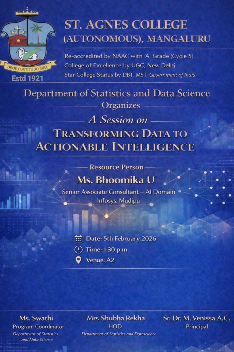The Department of Statistics and Data Science organised a session on “Transforming Data to Actionable Intelligence” was conducted on 05 February 2026 at 1:30 PM in A2 Hall for all Statistics and Data Science students. The resource person was Ms. Bhoomika U, Senior Associate Consultant – AI Domain, Infosys, Mudipu. The session focused on how organizations convert raw data into meaningful and actionable insights using modern big data and cloud technologies. She provided an overview of tools and platforms such as Hadoop, Apache Spark, AWS, Microsoft Azure, and NoSQL databases, explaining their role in large-scale data processing, cloud-based analytics, and handling unstructured data. She also highlighted real-time industry applications, the importance of AI-driven decision-making, and the skills required to succeed in the data analytics domain. The session was informative, interactive, and highly beneficial for students, helping them understand the practical implementation of big data technologies in industry.