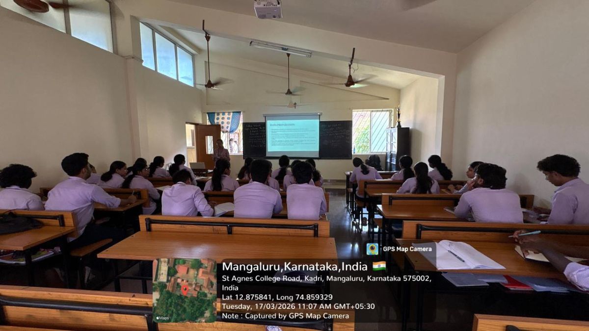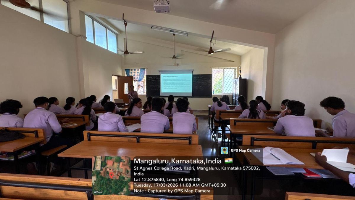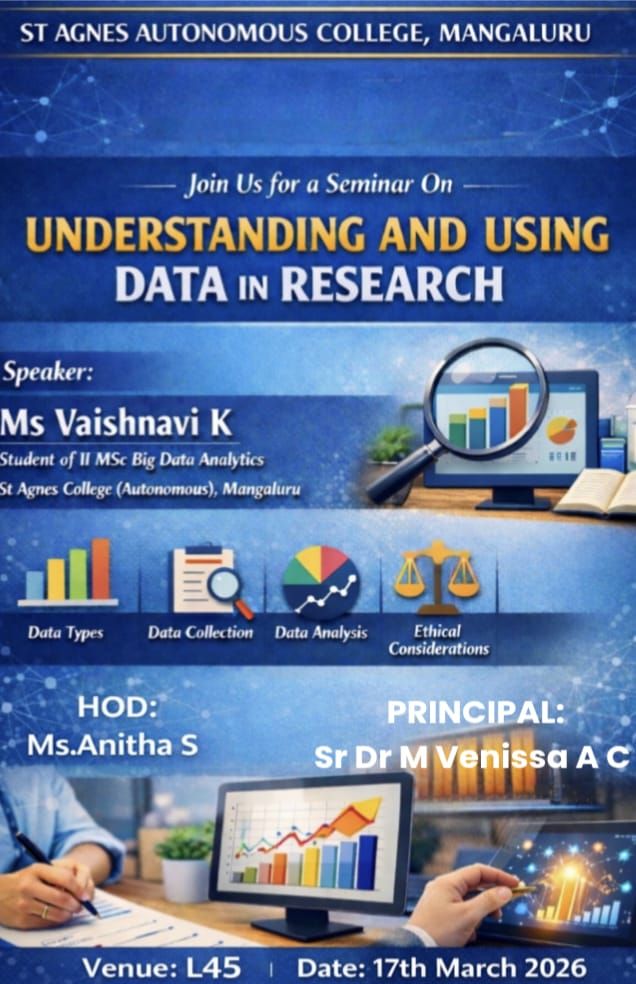 The Department of Business Administration, St. Agnes College (Autonomous), Mangaluru, organised a seminar on “Understanding and Using Data in Research” for II BBA students on 17 March 2026 at 10.45 am in L45. Ms Vaishnavi K, II MSc Big Data Analytics, St Agnes College (Autonomous), Mangaluru, was the resource speaker. The session explained what data is, the different types of data (primary and secondary), and how data can be collected through surveys, interviews, and observations. The resource person also highlighted the importance of organizing, analyzing, and interpreting data correctly to draw meaningful conclusions. Simple tools such as Excel and basic statistical methods were introduced to make data handling easier. Overall, the session helped students understand how to use data effectively to improve the quality and reliability of research.