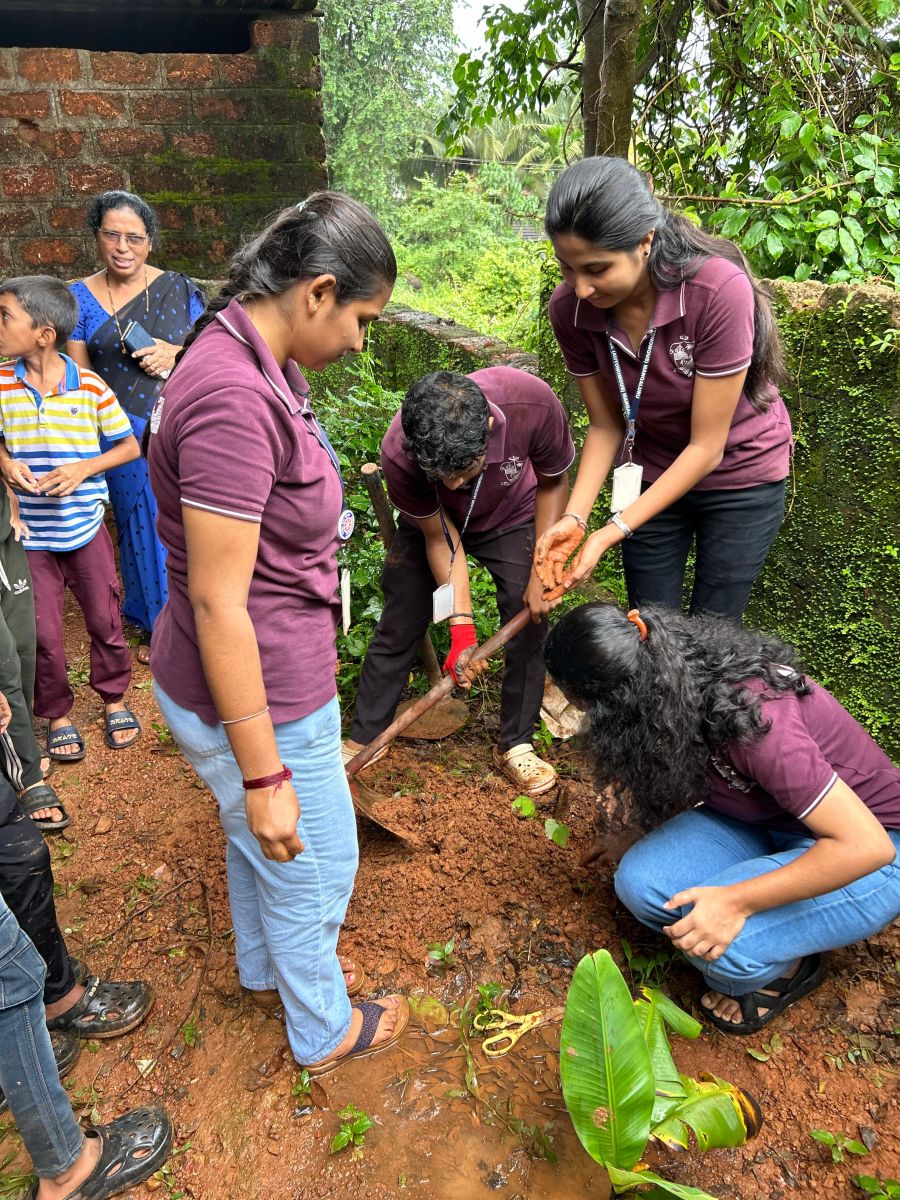The sapling plantation activity began at 11:30 AM, marking the highlight of the event. Some school children had brought their own saplings to contribute to the cause. Five saplings from our college were planted in the school’s backyard farm area, with enthusiastic participation from our volunteers and school students. The remaining five saplings were planted in front of the school office building. With active help from the school students and staff—digging, watering, and assisting throughout—the plantation drive was carried out joyfully and efficiently. Throughout the event, our student volunteers were actively engaged with the children—playing, talking, and creating bonds that made saying goodbye at 12:15 PM quite difficult.