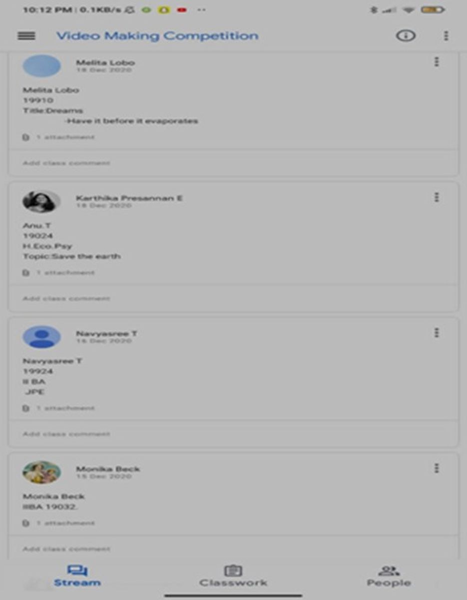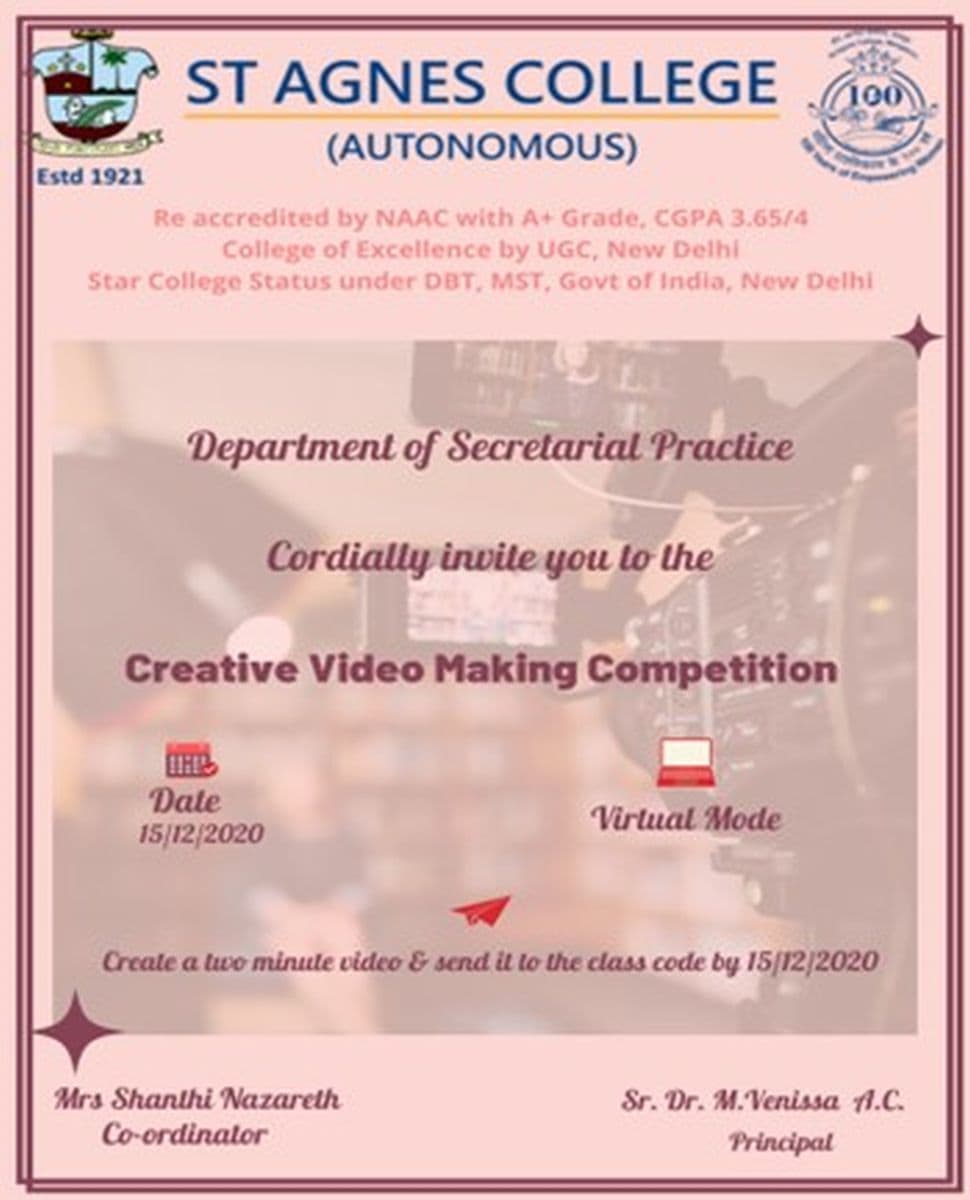 The Department of Secretarial Practice, St Agnes College (Autonomous), Mangaluru organized a ‘Creative Video Making’ Competition on 15 December 2020 for the students of Arts Stream. To enhance their technical skills and creativity during pandemic time was the main purpose of organizing this event. There were 49 students who participated and submitted their two-minute video to the respective Google Class code which was given to the respective classes. Class wise prizes were given to the students.