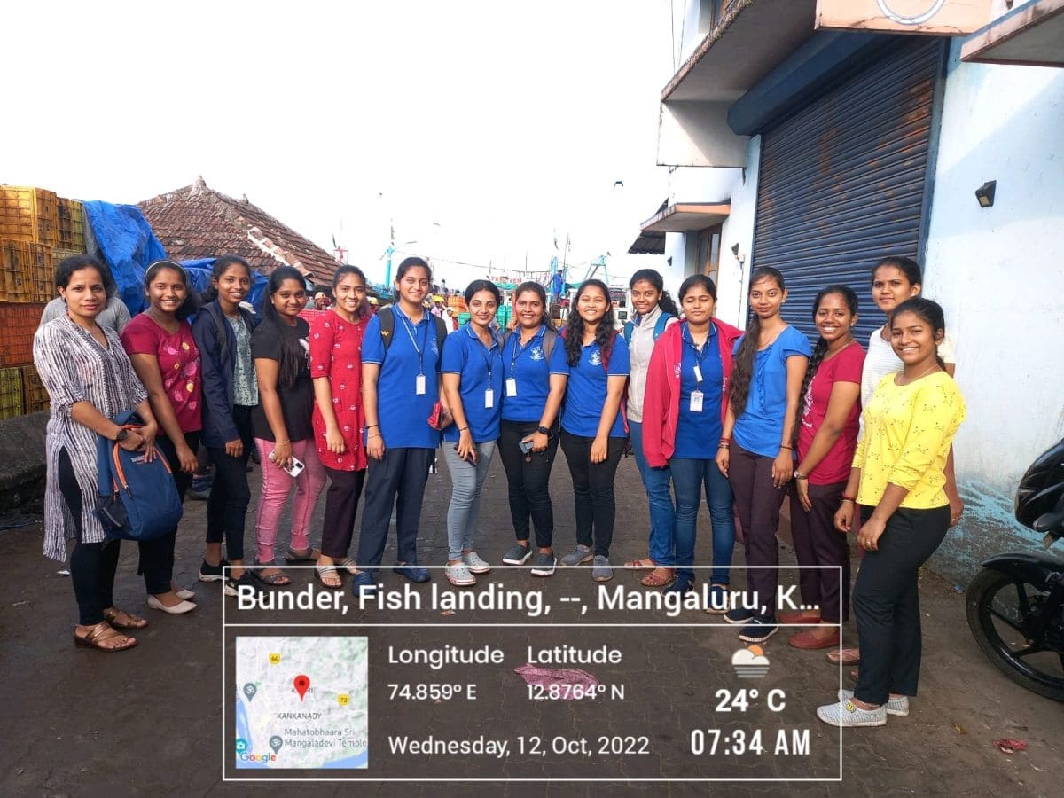 The Department of Zoology, St Agnes College (Autonomous), Mangaluru organised visit to Fish landing centre, Bundher, Mangalore on 12 October 2022 for the Open Elective students of First degree and the Second degree students who have taken up Project work. Students studied the different varieties of fish stock, its handling process and marketing at the landing centre. 13 students accompanied by Ms Vivid Dsouza and Ms Vishma Dcunha, Department of Zoology visited the landing centre.