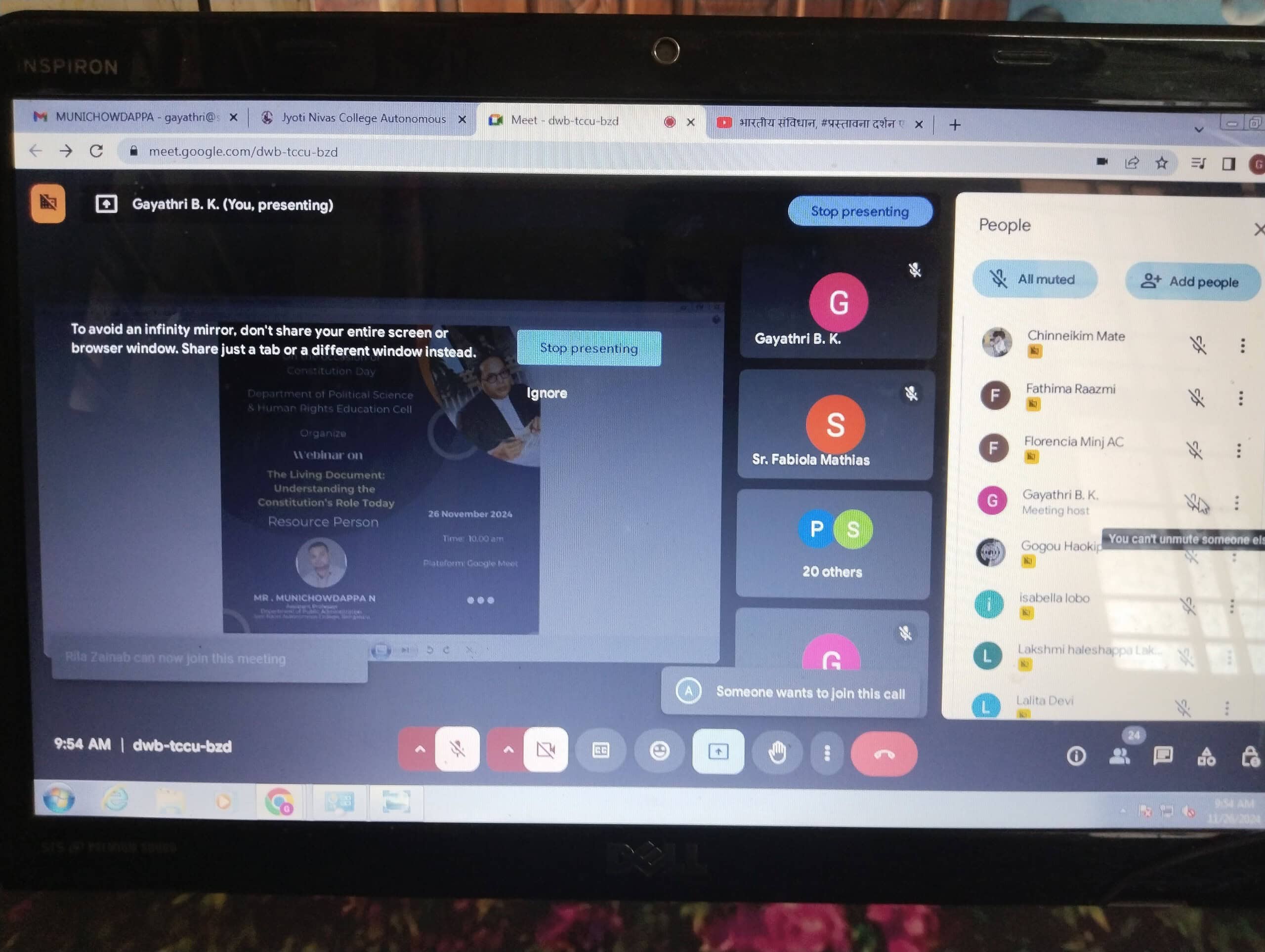 Mr Muni Chowdappa, Assistant Professor, Department of Public Administration, Jyoti Nivas College, Bengaluru, was the resource person for the webinar. The session began with a warm welcome and an introduction to the theme of the webinar with the song of preamble.