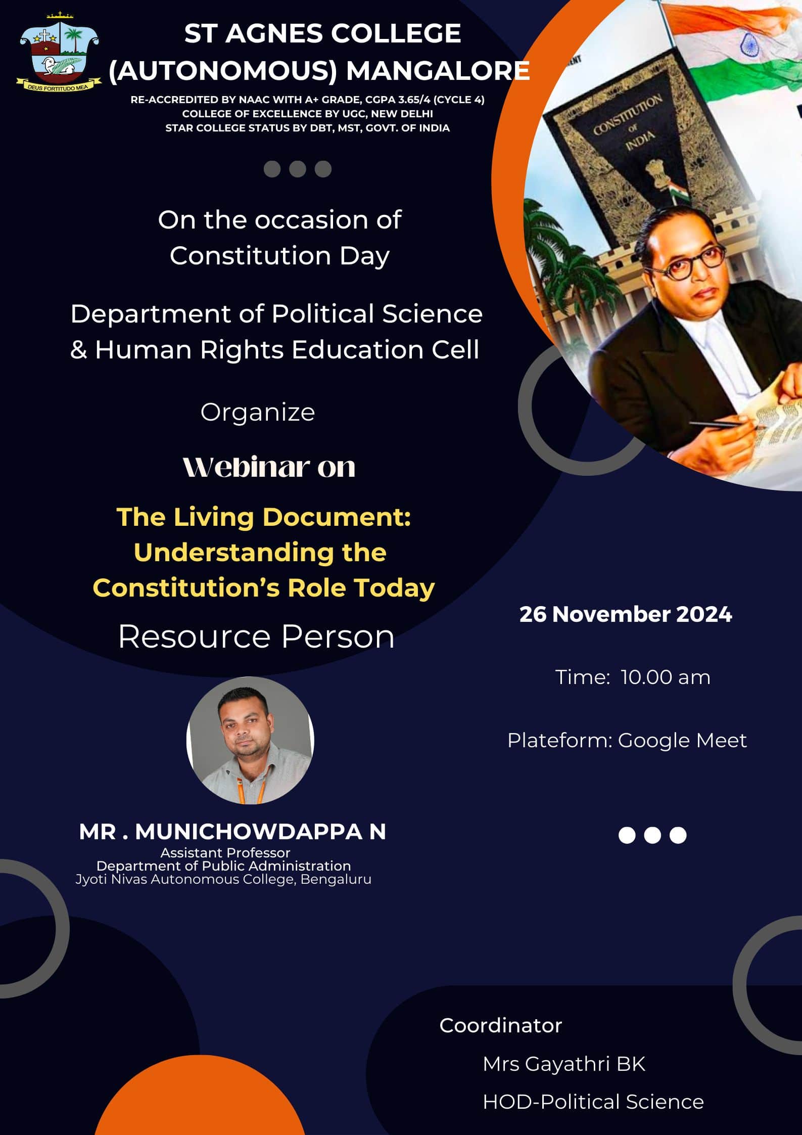 In observance of Constitution Day, the Department of Political Science and Human Rights Education Cell organised a webinar titled “The Living Document: Understanding the Constitution’s Role Today” on 26 November 2024.