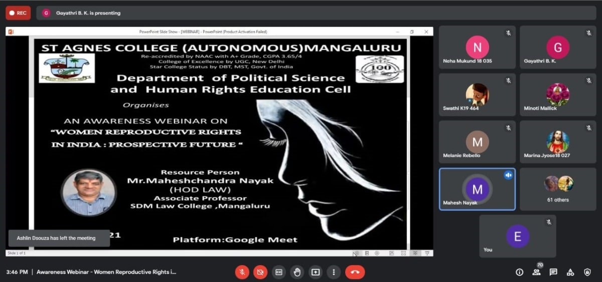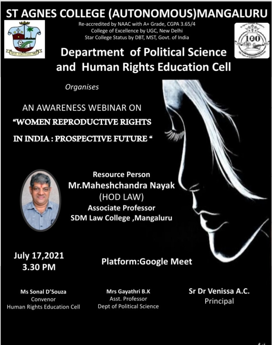 The department of Political Science and Human Rights Education Cell organised a webinar An Awareness on Women Reproductive Rights in India :Prospective Future for the under Graduate and law students of various colleges of Mangalore on July 17, 2021