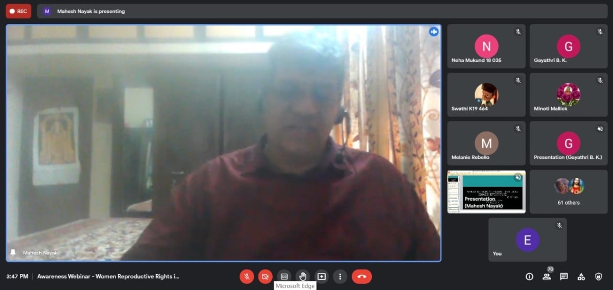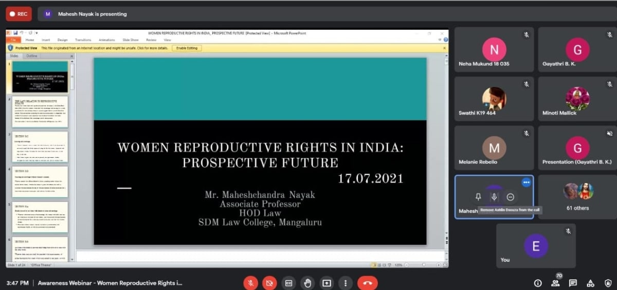 Speaker addressed students on different kinds of circumstances under which reproductive decision can be taken and he highlighted the different legislations that deal with the reproductive health of women. The concept of abortion and surrogacy were the highlighting points of the webinar.