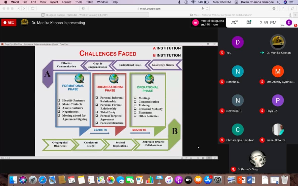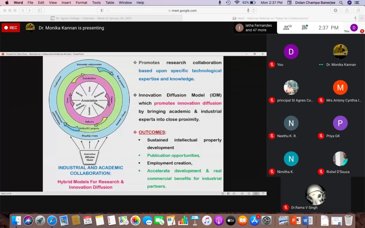The inaugural program started with a short prayer. Sr. Dr. M Venissa A.C, Principal, St. Agnes Institutions elaborated the importance of collaborations in the competitive edge. Dr. Neethu Suraj, Dean of Commerce and Business administration and Organizing Secretary of the webinarintroduced the resource speaker Dr. Monika Kannan, Dean Research & Coordinator IQAC, Sophia Girls’ College (Autonomous), Ajmerand Ms. Dolan Champa Banerjee, Department Head, Post Graduate Department of Commerce and Convenor of the webinar moderated the whole session.