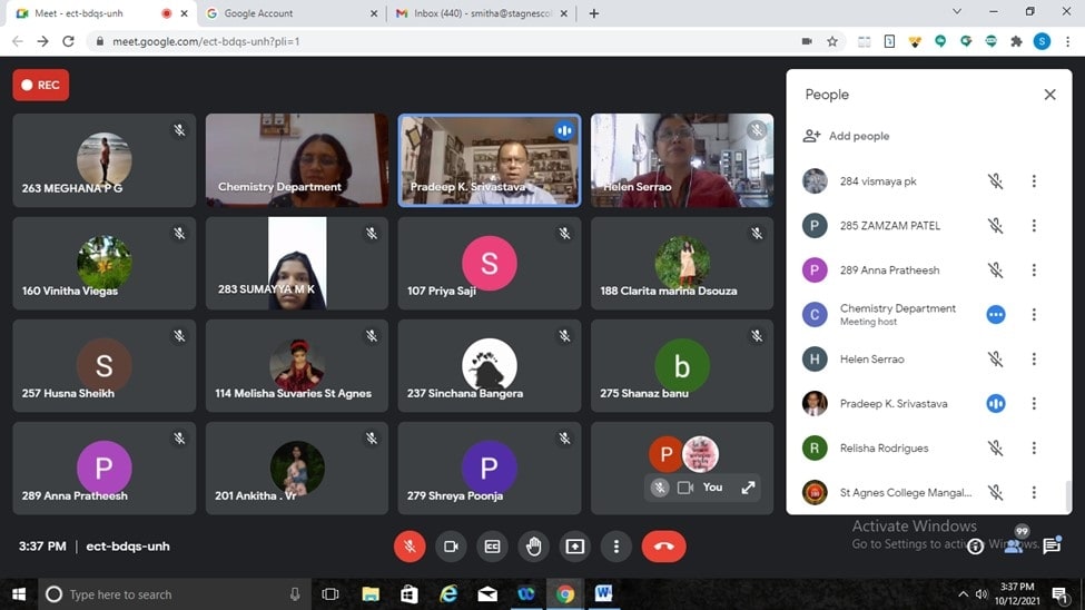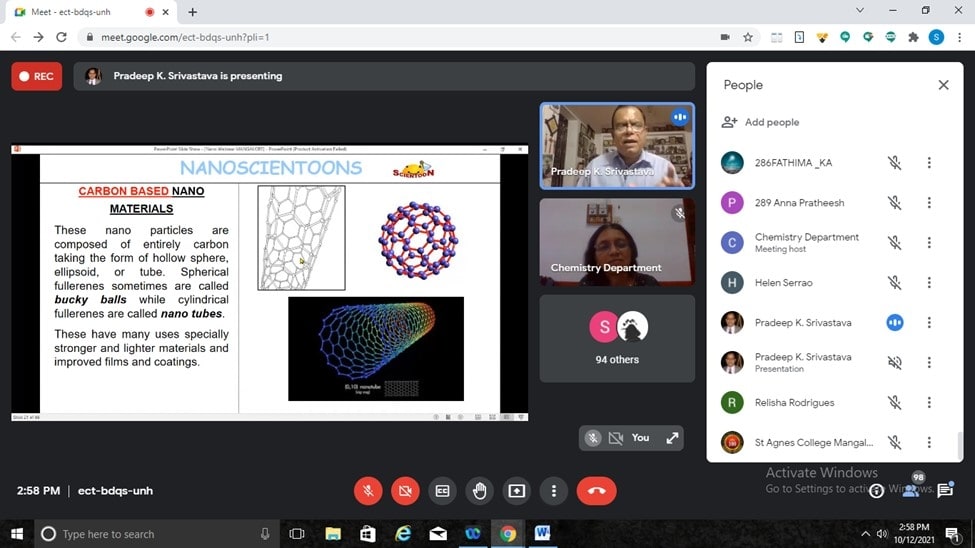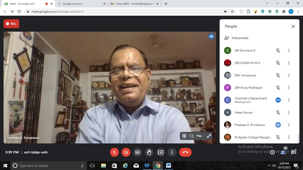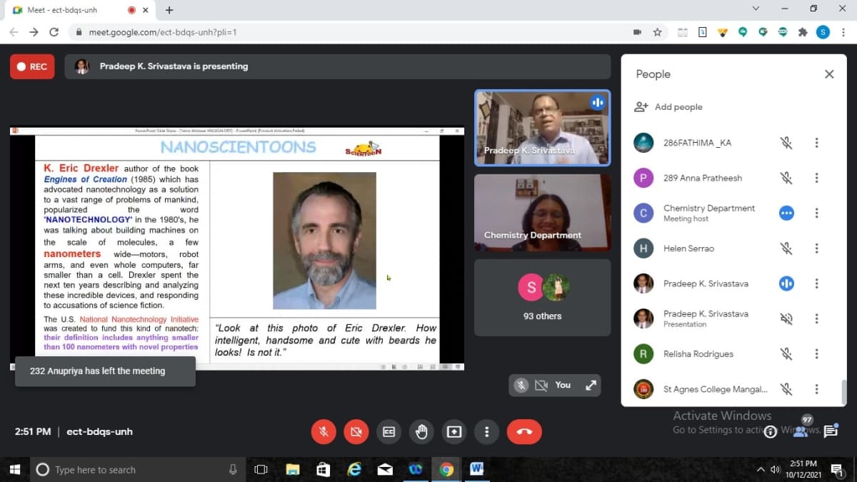 The Department of Chemistry St Agnes College (Autonomous), Mangaluru organised a webinar on Nanotechnology- Technology of the future on 12 October 2021. The Resource persons was Pradeep K Srivastava, Former Dy. Director (Senior Principal Scientist) in the Medicinal and Process Chemistry Division of CSIR-Central Drug Research Institute, Lucknow. He is the first person in the world to start a novel concept called “SCIENTOONS” a new class of cartoons, which are based on science.