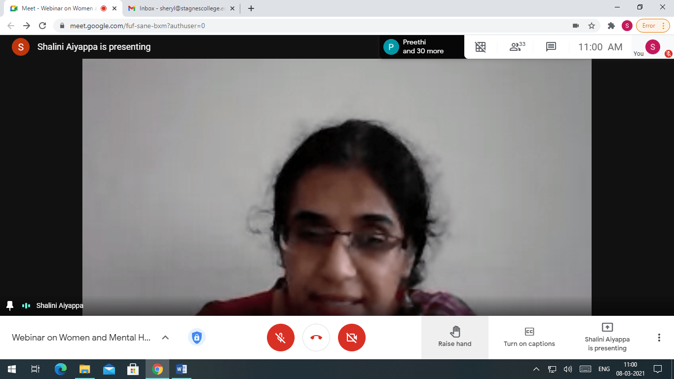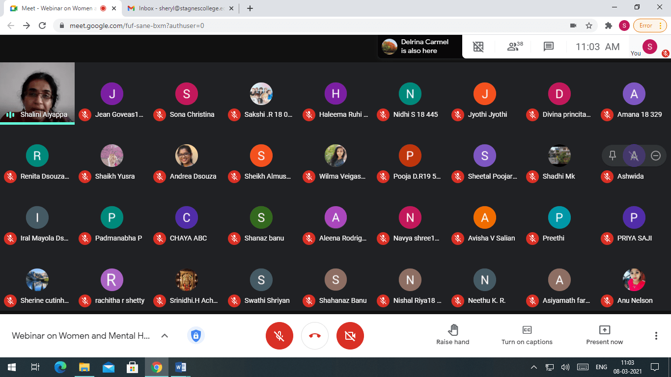 On the occasion of International Women’s Day, Women’s Cell of St Agnes College (Autonomous), Mangaluru organised a Webinar on Women and Mental Health. Resource Person for the Webinar was Dr Shalini Aiyappa, Assistant Professor and Head of the Department of Psychology, St Aloysius College (Autonomous), Mangaluru.