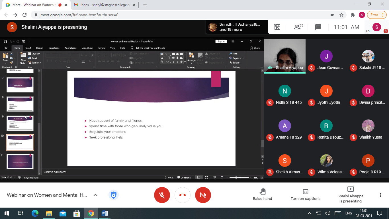 Mrs Sheryl Preethika, welcomed and introduced the resource person Dr Shalini Aiyappa. Ms Jean Goveas, Women’s Cell Secretary expressed words of gratitude. A total of 176 faculty and students had registered for the webinar. The webinar was appreciated by the participants.