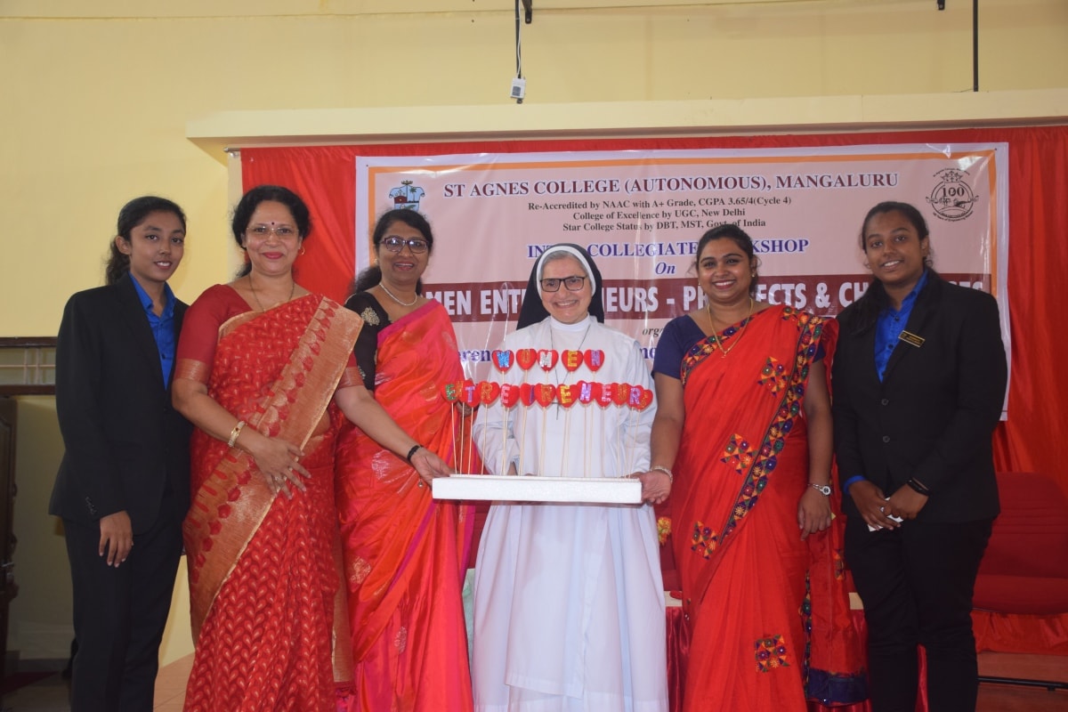 The workshop began with blessings of Almighty and a creative and an innovative inaugural by Sr. Dr. Jeswina A.C, Principal, St. Agnes College. Ms. Jc Tanuja Maben, Director, Forrader Akademi, Proprietress, Basil Cafe, was the chief guest for the programme. Ms. Jc Tanuja Maben addressed the budding entrepreneurs on 3D’s Dream, Decision and Destiny and to lead life out of imagination and stated that one needs to be motivated to follow his/her passion, take risks and fulfil dreams.