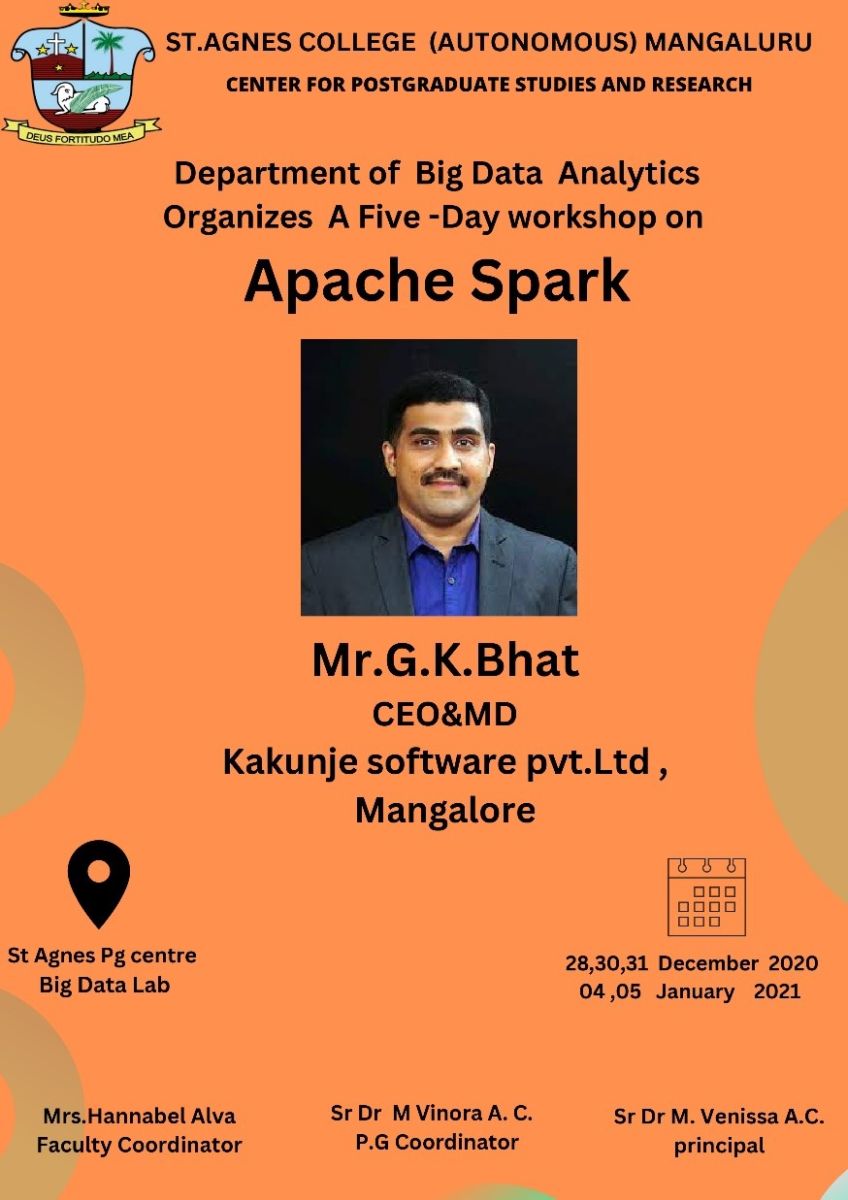A 5- Day workshop titled “A Quick Start to Apache Spark” was conducted during the Christmas break-December 2020 on 28, 30, 31 December 2020 and 4 and 5 January 2021 at St Agnes College (Autonomous), Mangaluru. The resource person for the workshop was Mr G.K. Bhat, Director, Kakunje Software Pvt. Ltd, Mangaluru. The Department coordinators were Mrs Hannabel Alva and Ms Deepthi Maria Varghese, Assistant Professors, Department of Big Data Analytics.