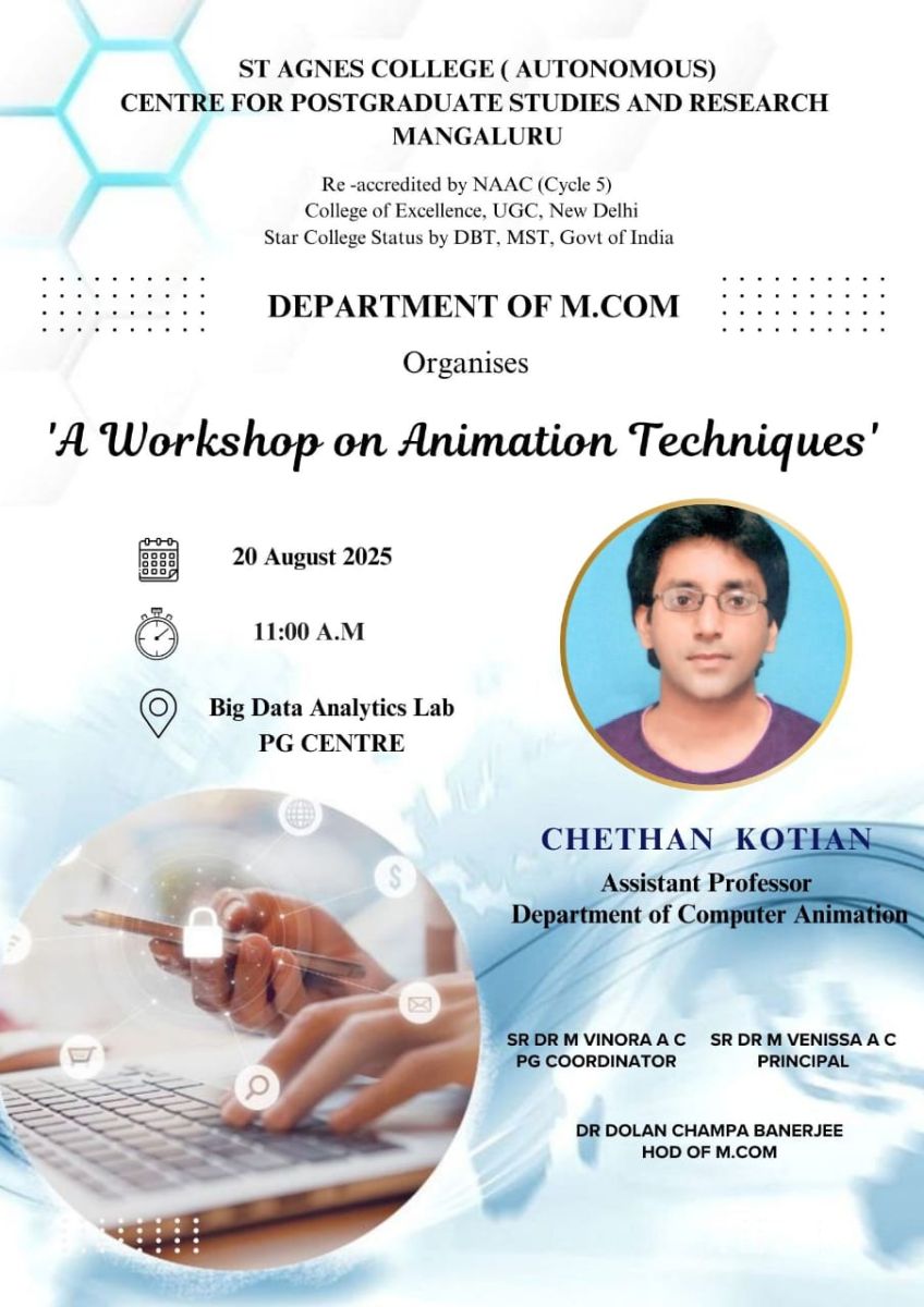 The Post Graduate Department of Commerce, Centre for Post Graduate Studies and Research, St. Agnes College (Autonomous) organized a workshop on Animation Techniques for the students of M.Com on August 20, 2025 from 11:00 A.M onwards in the Big Data Analytics Lab. The session was graced by the presence of the PG Coordinator, Sr Dr M Vinora A. C, and the Head of the Department of M.Com Dr Dolan Champa Banerjee.