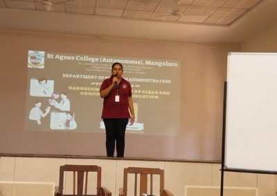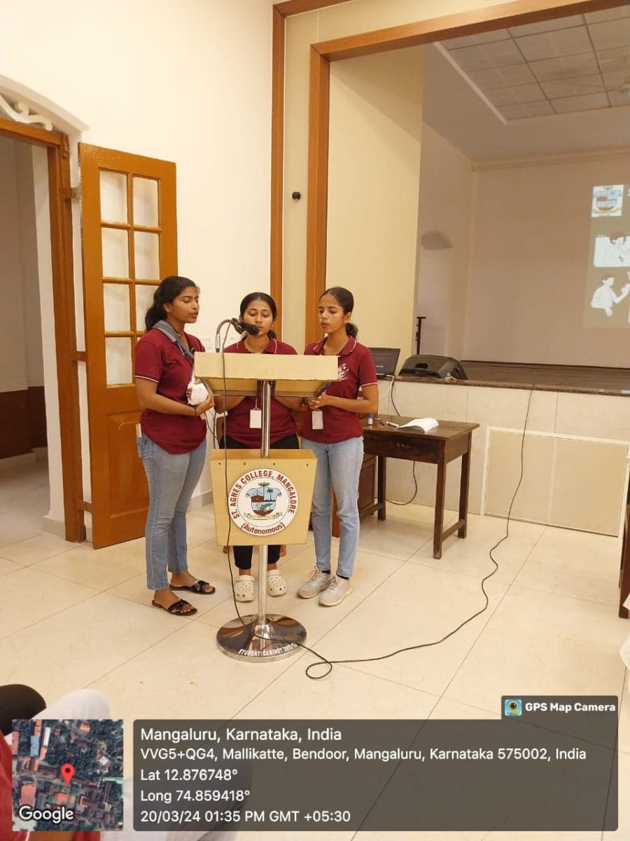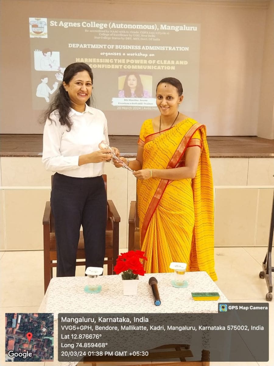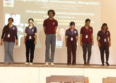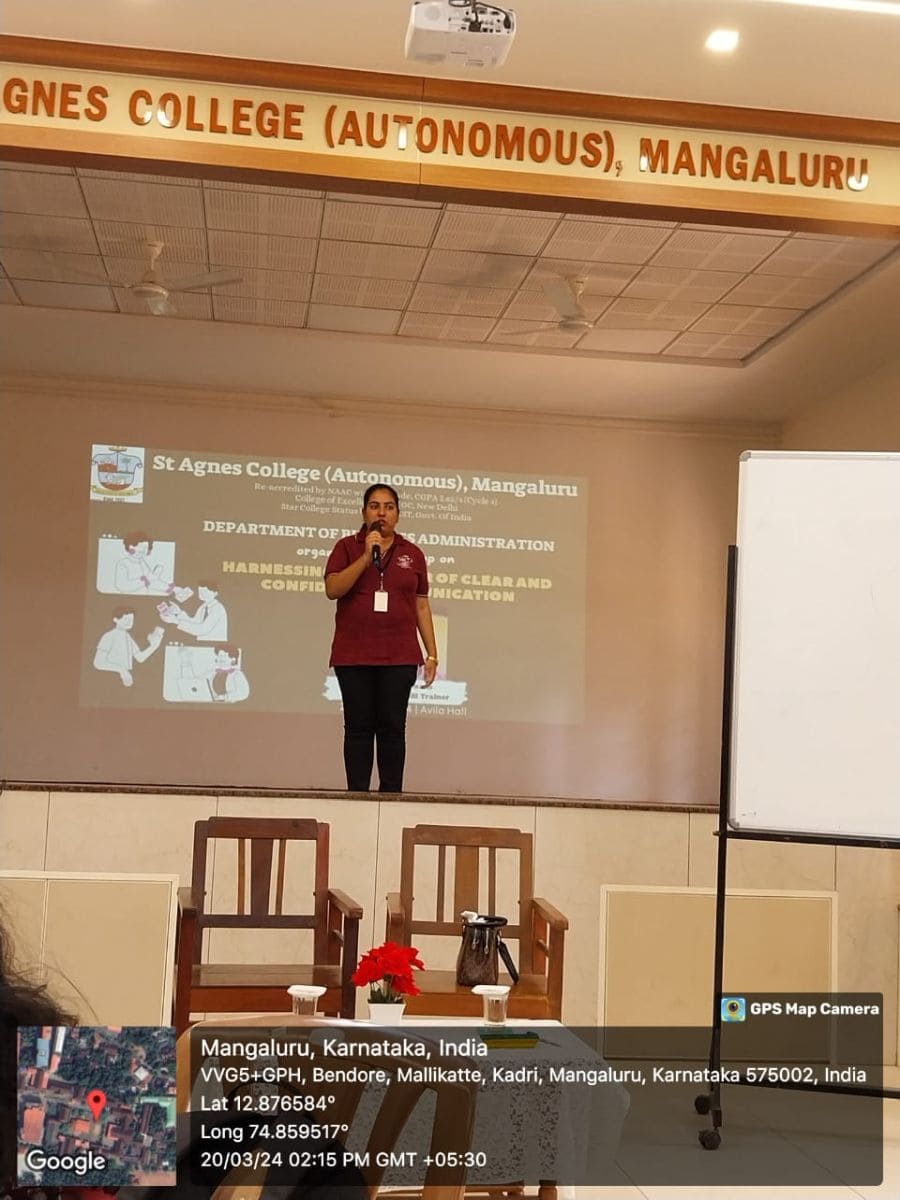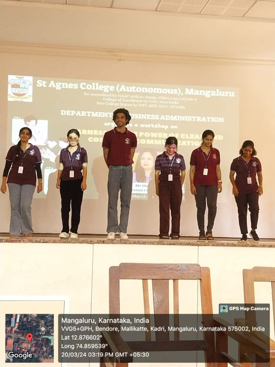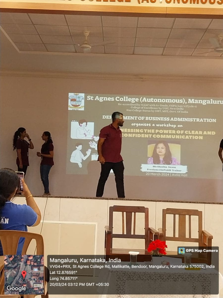 The Department of Business Administration, St Agnes College (Autonomous), Mangaluru organised a workshop on ‘Harnessing the Power of Clear and Confident Communication’ on 20 March 2024. The resource Person Ms. Shavina Soans, a freelance softskill trainer; started the session by dividing us into group of 14 with 7 people in each group. She conducted many activities, beginning with a communication game to understand the effect of poor communication. She explained the importance of body language, voice modulations, postures, presentation skills and many more. We were instructed to create our own tribe and enact it out on stage.