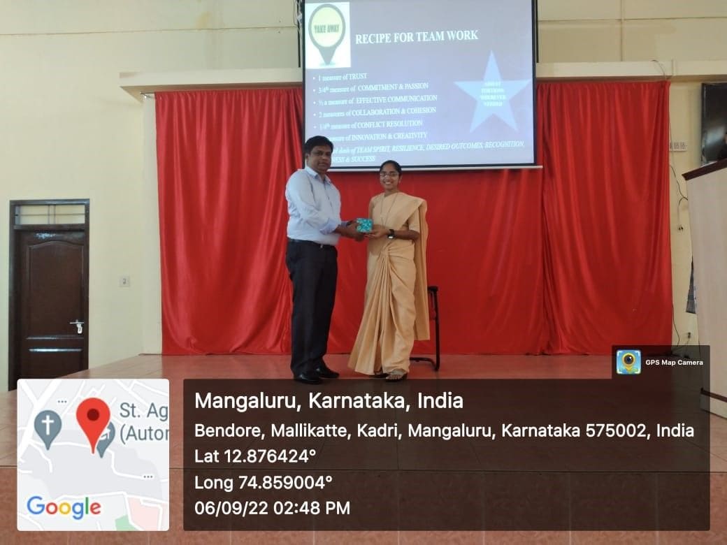 A Workshop on “Not I but V”, featuring Mr Prashanth Alison as the resource person, took place on 6 September 2022 at St Agnes College (Autonomous), Mangaluru. The event was organized for all First year B.Com. students as part of the Orientation Programme.