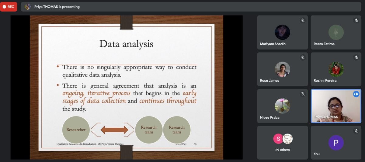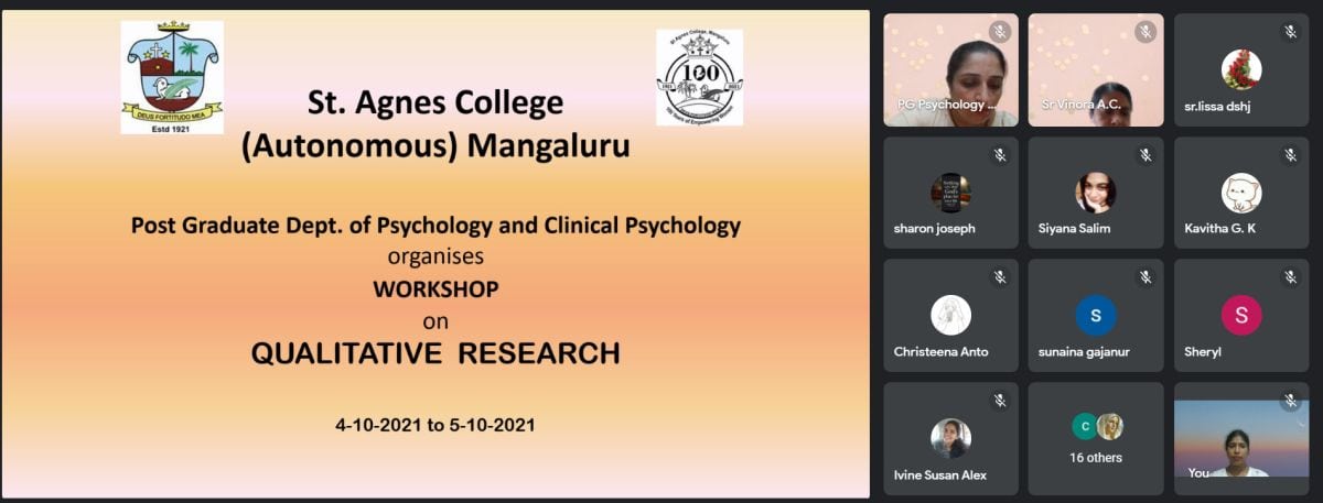 A workshop on Qualitative research was conducted by Centre of Post Graduate Studies and Research, St Agnes College (Autonomous), Mangaluru , on 4 and 5 October 2021. The workshop was taken by Dr Priya Thomas from National Institute of Mental Health and Neuroscience, NIMHANS, Department of Social work. She is engaged in developing and rendering psychosocial interventions in neurological disorders. She has special interest and expertise in qualitative research methodology and palliative care. In her inaugural address she said that qualitative research is important, and it is necessary to motivate the students to take up interest in research. Introduction to Qualitative Research, Approaches in Qualitative research, Data collection procedures in Qualitative Research and Data Analysis in Qualitative Research were the topics deliberated for the day. A total of 40 delegates participated. The core objective of the workshop was to equip the research scholars with a set of skills and potentiality to undertake the research very effectively in the disciplines of social science and to turn completed research into publishable material of high quality in the form of articles, journals, and books. This workshop offered the practical guidelines and directed the researchers through all the stages of research from identifying a research problem to the submission of a dissertation, report writing and research article. The course intended to deal with a variety of qualitative research methods used in social science research. It also gave exposure to data analysis with the help of software packages. The workshop consisted of both theory and practical. By the end of the programme participants were expected to develop conceptual clarity and practical knowledge to undertake quality research and write good research papers, field-reports and project proposals etc. The workshop commenced, after the registration of participants, introductions, and Inaugural function.
