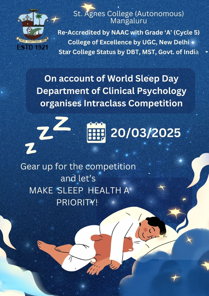 On the occasion of World Sleep Day 2025, the Department of Clinical Psychology, successfully organized an Intraclass Competition ON 20th March 2025 to raise awareness about the importance of sleep health. The event was held under the theme “Make Sleep Health a Priority!” and saw enthusiastic participation from 25 students.