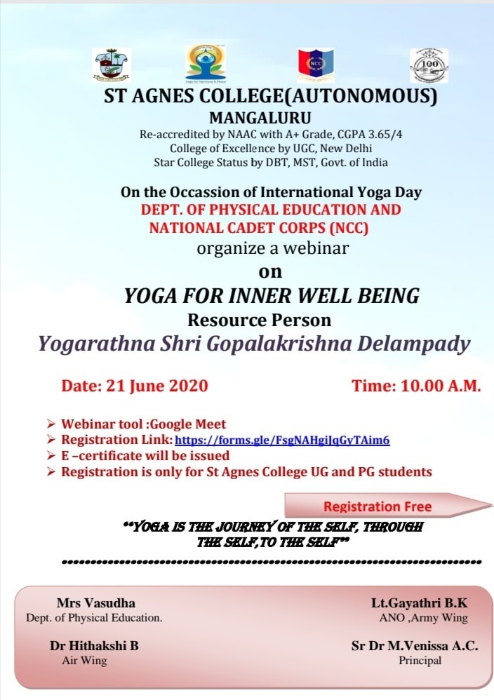 On the occasion of International Yoga Day 2020, a webinar on ‘Yoga for Inner Well Being’ was organized by the Department of Physical Education and National Cadet Corps (NCC) at St Agnes, (AUTONOMOUS) Mangaluru.