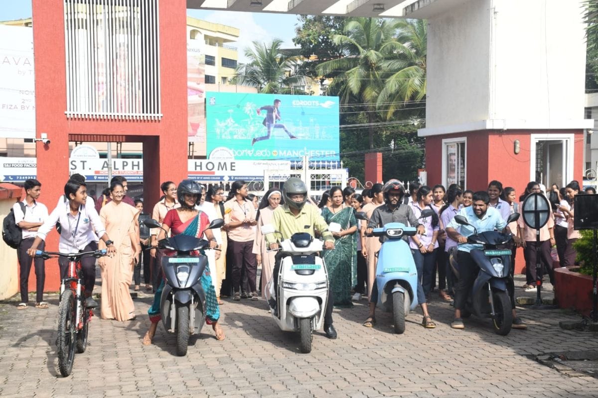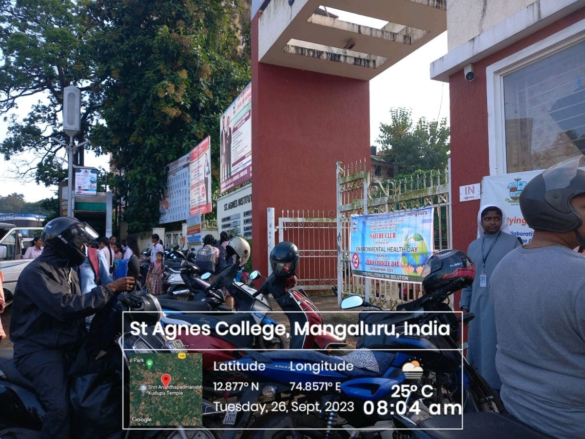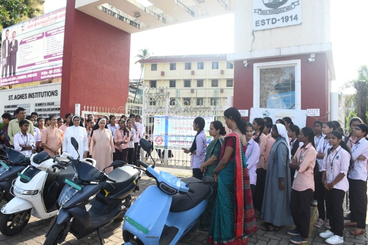 In observation of World Environmental Health day on 26 September 2023, Nature Club at St Agnes College (Autonomous), Mangaluru organized ‘Zero Vehicle Day’ in collaboration with St Agnes Higher Primary School, St Agnes CBSE School, St Agnes High School and St Agnes Pre University College, to make significant impact in protecting our environment. Motor bikes, cars and any other polluting vehicles were not allowed into the campus, to raise awareness on global warming and climate change to combat daily carbon emissions. Only bicycles and electric vehicles were allowed to enter the campus. The day was inaugurated with the electric vehicles moving into the campus followed by the dignitaries and the students marching inside. Sr Dr Maria Roopa A.C., the Joint Secretary of St Agnes Institutions, Sr Dr Venissa A.C., the Principal, Sr Carmel Rita A.C., Administrator, Sr Clera A.C., the Vice Principal and Ms Vivid Dsouza, Nature Club Co- ordinator were present. Sai Tanvi, Secretary of Nature Club spoke about the importance of the day. Being the first one of a kind, all the students, staff and the parents showed great interest and participated in this noble cause of lowering the carbon emission to keep the campus free from noise and air pollution and in promoting the usage of public transport. As no vehicles were allowed inside the gate, Nature club members helped the school children to move into the campus in the morning and in the evening.